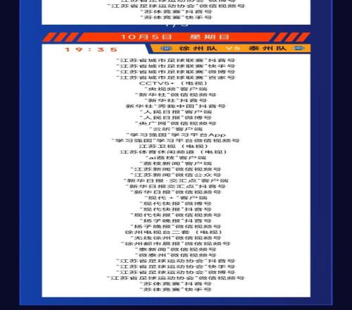現(xiàn)代快報(bào)訊(記者 王衛(wèi))10月4日、5日、7日、8日,蘇超八強(qiáng)淘汰賽將在國(guó)慶中秋雙節(jié)假期期間激戰(zhàn)四場(chǎng)。10月3日,蘇超官方微信公眾號(hào)發(fā)布了淘汰賽(10月4日-5日)轉(zhuǎn)播計(jì)劃表,現(xiàn)代快報(bào)記者注意到,10月4日晚南京對(duì)陣連云港、10月5日晚徐州對(duì)陣泰州的比賽,CCTV5+(電視)均轉(zhuǎn)播。記者了解到,這是央視電視端首次直播蘇超賽事。