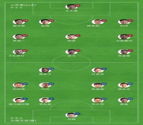 山東泰山首發(fā):14-王大雷、5-鄭錚、11-劉洋、15-路易斯-洛佩斯(F)、55-彭嘯、8-馬德魯加(F)、22-李源一、9-克雷桑(F)、10-卡扎伊什維利(F)、19-澤卡(F)、23-謝文能