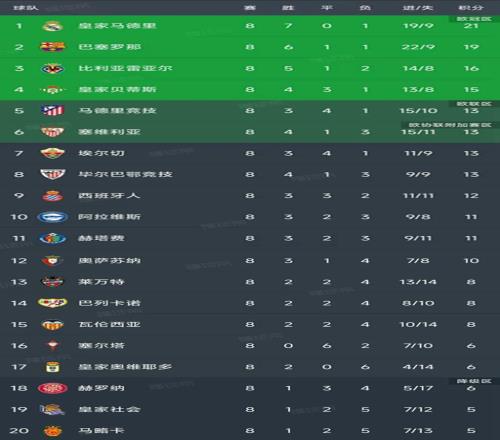 北京時間10月6日,西甲第8輪隨著巴薩1-4慘敗塞維利亞,西班牙人1-2不敵皇家貝蒂斯,皇家社會0-1巴列卡諾,塞爾塔1-1馬競的比賽結(jié)束,最新積分榜如下!