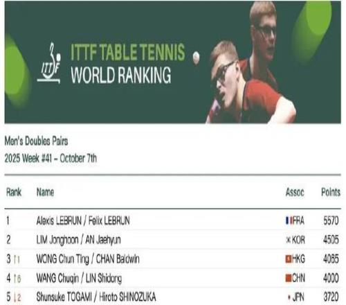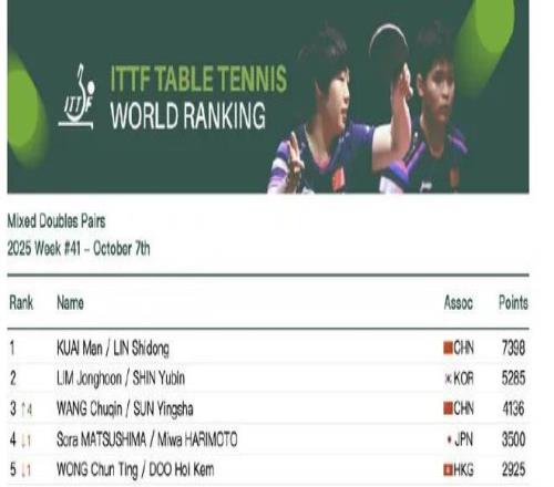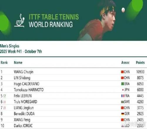 據(jù)央視新聞10月7日消息,今天,國(guó)際乒聯(lián)公布2025年第41周世界排名。