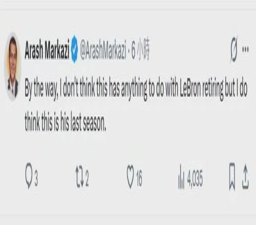 此外,湖人跟隊(duì)記者Arash Markazi表示,他始終認(rèn)為這次預(yù)告與退役無(wú)關(guān),“但我確實(shí)覺(jué)得這會(huì)是詹姆斯的最后一個(gè)賽季”。