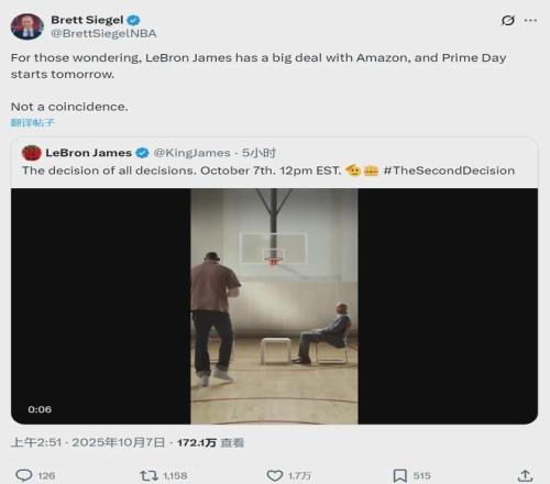 不過(guò)Clutch Points的記者Brett Siegel給了另一種說(shuō)法:“詹姆斯跟亞馬遜簽了一份大合同,Prime會(huì)員日則在明天開(kāi)始,這絕非偶然?!?/p>