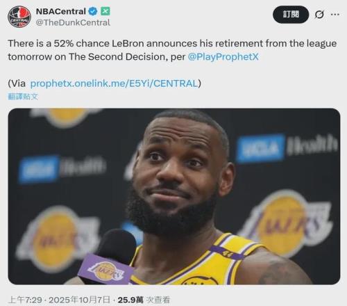 對(duì)此,美國(guó)頂級(jí)體育預(yù)測(cè)市場(chǎng)Prophet X做出了判斷,他們預(yù)測(cè)詹姆斯在今天凌晨宣布退役消息的概率為52%。