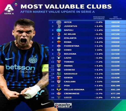 德轉(zhuǎn)更新后意甲俱樂部球員總身價排名: