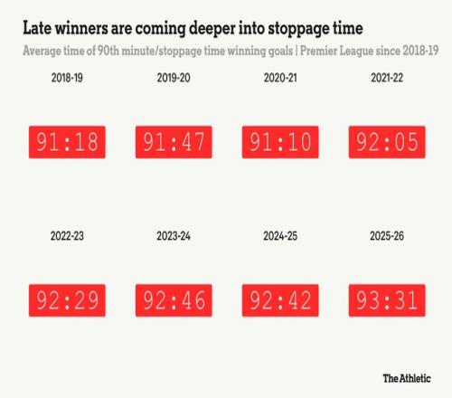 這一變化將決定性的時刻推得更晚。本賽季補時進球的平均時間出現(xiàn)在第93分31秒,這是過去八個英超賽季中最晚的一次。