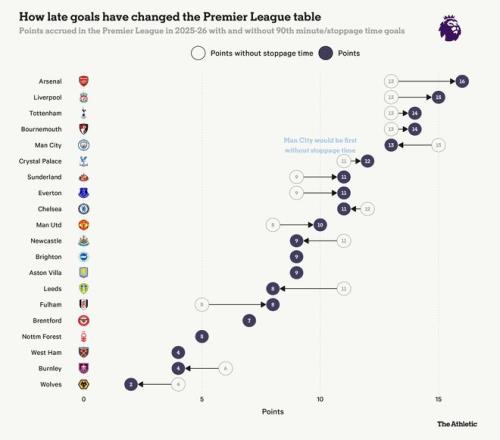 如果沒有補時階段,曼城本應高居榜首。如果他們能在與阿森納的1-1戰(zhàn)平中阻止加布里埃爾-馬丁內(nèi)利的補時扳平進球,他們還能多得兩分。利物浦則在補時階段接連以1-2輸給了切爾西和水晶宮,但由于對陣紐卡斯爾聯(lián)和伯恩利時的補時絕殺,他們的整體表現(xiàn)依然在補時階段有所盈余。