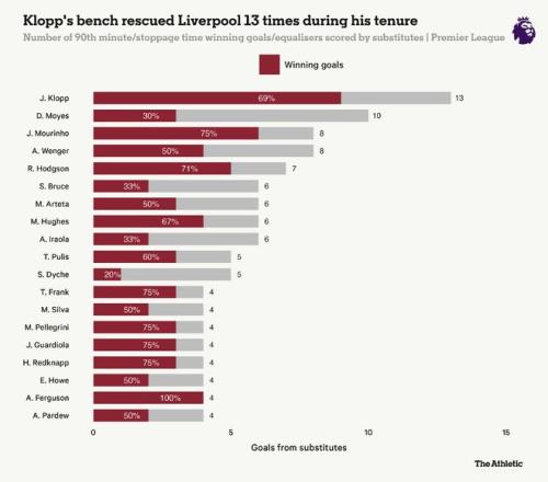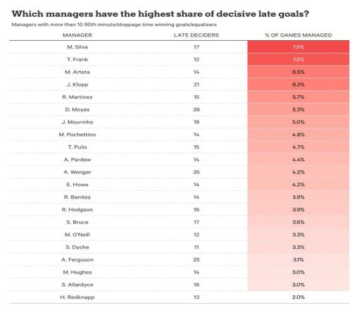 以下是所有擁有超過10個補時關(guān)鍵進球的教練名單。弗格森在總排名中位列第三,但這反映了他在810場英超比賽中執(zhí)教的長久性;從百分比來看,他排在倒數(shù)第四。位居榜單前列的是馬爾科-席爾瓦、托馬斯-弗蘭克和阿爾特塔三位現(xiàn)任英超主帥,這也進一步證明了我們確實正處于補時進球的時代。